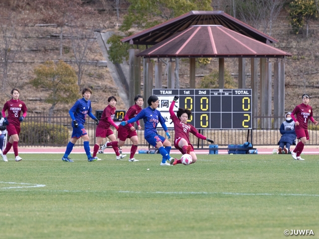 山梨学院大学DF陣の出足の速さの前に、福岡大学はなかなか相手ゴール前に攻め込めません。27分にはFKを斉藤彩乃選手がゴール前に上げるもGKがキャッチ。CKのチャンスではDF陣の堅守にシュートを阻まれます。対する山梨学院大学は前半終了間際44分、木許和心選手からのパスを受けた浜田選手が相手DFをかわし左足でシュートを放ちゴール、点差を2に広げます。