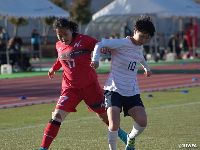 立ち上がりから日本大学が主導権を握る展開となります。前半5分、日本大学は中央での混戦から藤原愛里選手がシュートを放ち先制点を奪います。さらに14分、油本明佳里選手のクロスを西野早紀選手が頭で合わせて追加点を奪います。その後も日本大学が相手ゴールに迫る展開が続きます。八戸学院大学も体を張って追加点を阻止します。ボールを奪い、宮野日和選手や及川桃選手を中心にゴールへ迫りますが、日本大学の守備陣が落ち着いて対応、ゴールには至りません。前半終了間際、混戦から日本大学の藤原選手がシュートを放つものの八戸学院大学・GK小林ちひろ選手の好セーブにより得点とはならず、そのまま前半を2-0で折り返します。