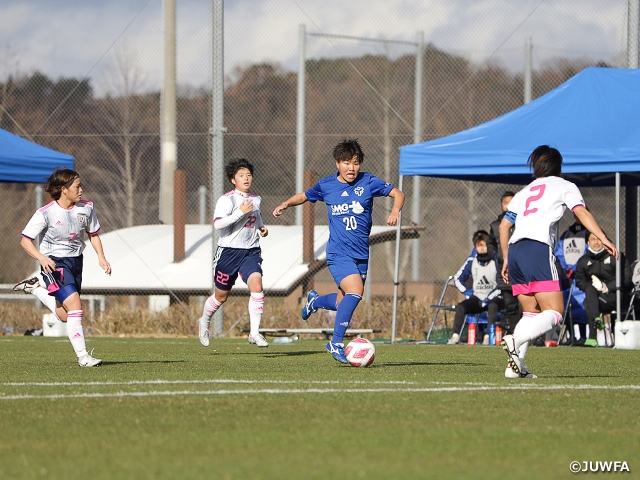開始早々、新潟医療福祉大学がシュートを放ち、試合が幕を開けます。しかしそこからは一転、パスを繋ぐ新潟医療福祉大学に対して、日本体育大学のプレスがはまり、思うように攻撃が出来ません。そして、前半11分のシュートを機に日本体育大学が勢いづきます。13分、窓岩日菜選手のクロスをDFがクリアしきれず、オウンゴールで日本体育大学が先制。24分にはカウンターから左サイドを崩すもののシュートはポストに弾かれます。続く31分、右サイドからのクロスに対するこぼれ球に反応した知久奈菜穂選手が追加点を挙げます。さらに41分、2点目を挙げた知久選手がワンツーから左サイドを崩し、北沢明未選手がニアで合わせて3点目。前半を3対0、日本体育大学リードで折り返します。