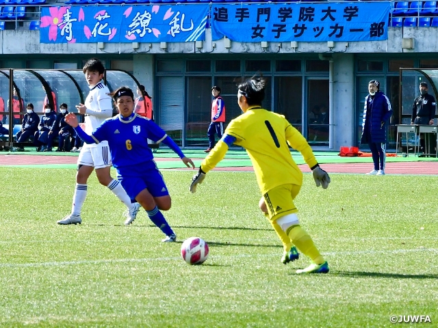開始早々、背後へのボールに反応した東洋大学の門脇真依選手がループシュートを決めて先制に成功します。追いつきたい追手門学院大学も尾崎恵選手のポストプレーから仁木愛実選手のドリブル突破で反撃を試みますが得点にはつながりません。27分、追手門学院大学は前線からの連動した守備から大場柚季選手がミドルシュートを放ちますが、惜しくも枠外に外れてしまいます。しかしそこからペースを掴み出した追手門学院大学が徐々に東洋大学のゴール前に迫るシーンが増えていきます。