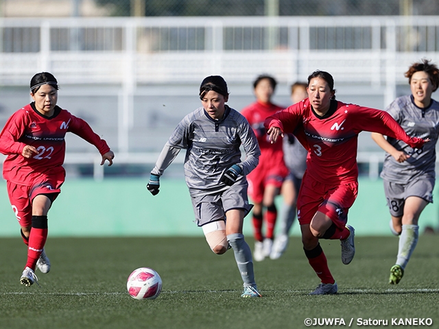序盤からボールが落ち着かず競り合う展開となりますが、3分に山梨学院大の甲斐碧海選手がミドルシュートを放ちます。ここから山梨学院大が攻め込みますが、日本大は堅守でこれを跳ね返します。10分には日本大がフリーキックを獲得し、ゴール前の混戦となるも山梨学院大・GK武田あすみ選手が弾き、ピンチを切り抜けます。山梨学院大は勢いを持った攻撃を続け、20分には左サイドからのクロスに甲斐選手が合わせますが、惜しくもゴールの上。ここからさらに攻撃に厚みをかけた山梨学院大は22分にコーナーキックを獲得すると、嶋田華選手が頭で合わせ先制点を挙げます。その後も山梨学院大が攻め込む時間帯が続きますが、日本大は牧野美優選手を中心に体を張った守備で決定機を作らせません。すると1点を返したい日本大は29分、ハイプレスからボールを奪うと、裏へのパスに抜け出した藤原愛里選手が冷静に決め切り、試合を振り出しに戻します。しかし43分、山梨学院大がコーナーキックを獲得すると、ゴール前の混戦でこぼれたボールに反応した嶋田選手が押し込み、山梨学院大が再びリード。前半アディショナルタイムにも山梨学院大がペナルティキックを獲得し、浜田芽来選手がゴール左側に沈め、3点目を奪います。その後、スコアは動かず前半は終了し、試合を折り返します。