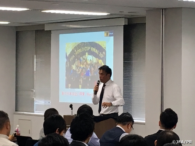 本年度は、「コンディショニングについて」をテーマに、昨年行われた2018 FIFAワールドカップロシアで躍進したSAMURAI BLUE(日本代表)に帯同された土肥ドクター、前田トレーナーから、それぞれの立場から大会期間中のコンディショングについて、U-17女子日本代表、U-20女子日本代表トレーナーからはそれぞれ帯同したワールドカップについての報告がありました。さらには、アンチ・トーピングやスポーツ救命ライセンス講習会についても講義が行われました。また、特別講演として、影山雅永U-20日本代表監督を招いて、「チームに求められるトレーナーの役割」と題し、トレーナーとチームとの関わり方などをお話いただきまた。その後、各カテゴリー毎に分科会を実施し積極的な意見交換が行われ、参加者にとって充実したセミナーとなりました。