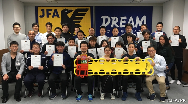 スポーツ救命ライセンス講習会が3月9日(土)にJFAハウスで開催されました。今回の講習会にはトレーナーの方々に全国からお集まりいただきましたが、熱心に講義に耳を傾け、実技では胸骨圧迫やAEDの使用を行い、グループ内で声をかけあいながら、バックボード(担架)での搬送も手際よく体を動かしている姿が見られました。本講習会の合格者には修了証(3年間有効のライセンス証)が発行されます。また本講習会は、公益財団法人日本スポーツ協会公認アスレティックトレーナーが資格更新のために保有しなければならないBLS(Basic Life Support:一次救命処置)資格取得のための講習会として認定されています。