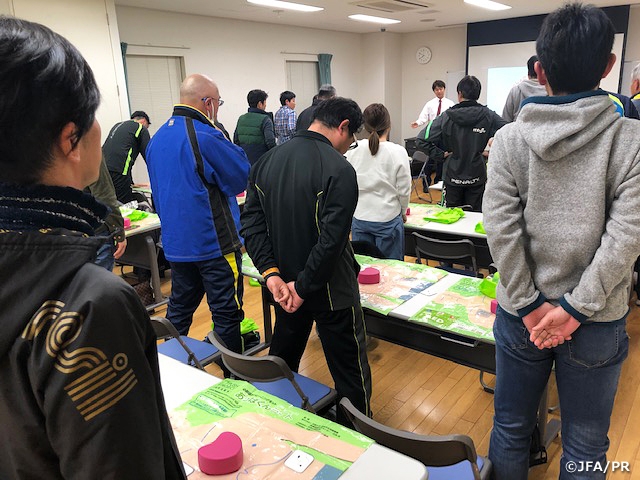 参加者は厚木市で4種を指導しているコーチ、保護者が対象で、厚木市サッカー協会4種技術部実技研修会のひとつとして実施されました。JFAからの熱中症と脳振盪(のうしんとう)に関する講義のあと、特定非営利活動法人大阪ライフサポート協会/PUSHプロジェクトによるCPR(心肺蘇生法)とAED(自動体外式除細動器)の使用方法に関する実技を行いました。およそ2時間の講習会の後、受講者全員に受講証が手渡されました。