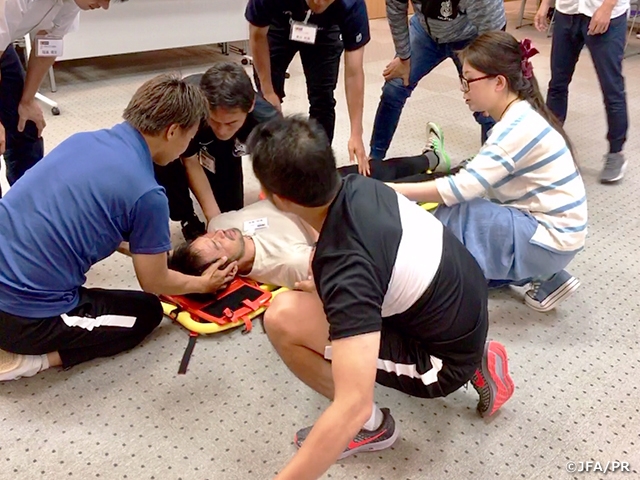 日本サッカー協会(JFA)は、ピッチ上の選手の安全を守ることを第一とした「スポーツ救命ライセンス講習会」と「JFA+PUSHコース(簡易救命講習会)」を2017年から実施しています。現在開催中の2019年度S級コーチ養成講習会の一環として「スポーツ救命ライセンス講習会」が6月4日にJISS(国立スポーツ科学センター)で開催されました。講師は、順天堂大学循環器内科助教で、JFAの「スポーツ救命プロジェクト」のメンバーでもある福島理文先生が務め、S級コーチ養成講習会受講者16名、担当インストラクターなど合計21名が参加。特に搬送の実技では受講者同士が大きな声をかけ合いながら患者役の受講生を丁寧にバックボードで運ぶなど、白熱した講習会になりました。約5時間の講習会後、受講者全員が合格し、修了証(3年間有効のライセンス証)が手渡されました。