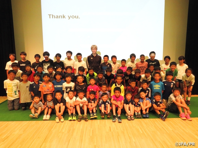 「レフェリーのお仕事って?」や「夏の熱中症対策(正しい水分の取り方)」「PUSHコース(簡易救命講習会)」「シューズの履き方・選び方」「サッカーボールのひみつ」の5つのテーマで各講師の方にお話し頂き、参加した子どもたちは熱心に聞き入っていました。