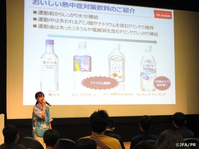 サッカーをしている子は、していない子に比べて外で運動している時間が長いので、熱中症のリスクと隣合わせだと言えます。だからこそ水分補給の正しい知識やその他の予防策を知ってもらうことで、しっかりと自分で自分を守れるようになってほしいと思います。保護者の方も知っていることも多かったと思いますが、お子さんと聞いていただくことで親子のコミュニケーションを取ってもらい、日頃から熱中症対策の話が出ればいいと思います。声掛けやみんなで予防していきましょうという話もしましたが、お子さん一人だと我慢して練習を頑張ってしまうので、そこは保護者の方にフォローしてもらいたいです。