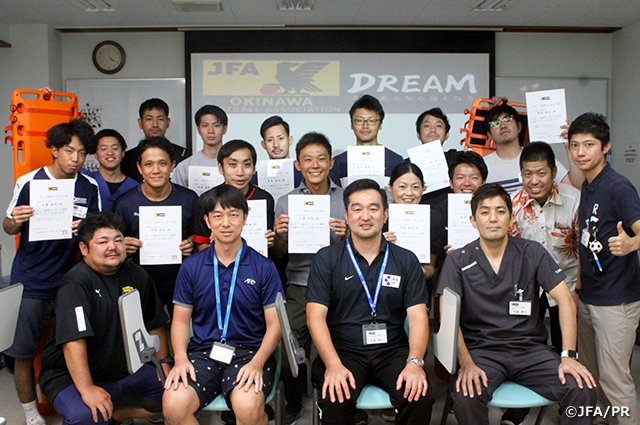 日本サッカー協会(JFA)は、ピッチ上の選手の安全を守ることを目的とした「スポーツ救命ライセンス講習会」を8月18日(日)、沖縄県浦添市の浦添総合病院で開催しました。