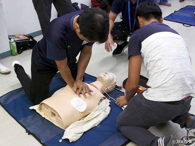 講習会ではピッチ上での選手の安全を守り、不測の事態に備えるため心肺蘇生法(CPR)や人形を使った自動体外式除細動器(AED)の正しい使用方法を実技で修得。またスポーツの現場で起こり得る可能性の高い脳振盪(のうしんとう)や熱中症、アナフィラキシー、窒息などによる応急処置法について講義が行われました。