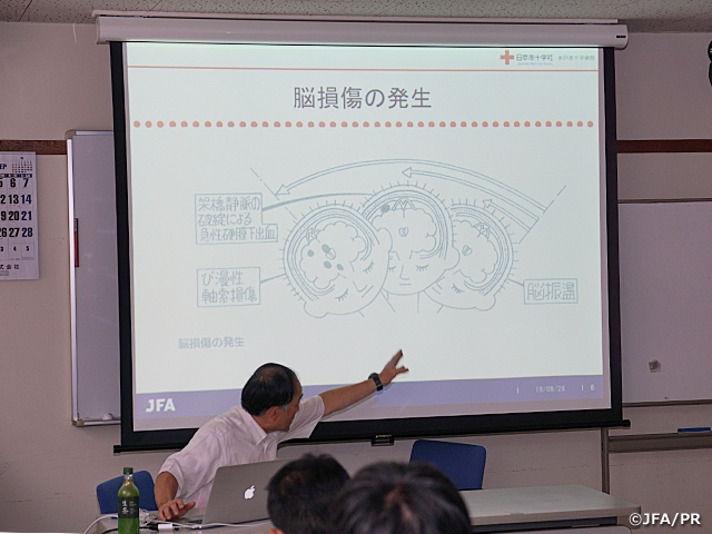 前半は、茨城県サッカー協会医学委員長の上牧 裕先生より、脳振盪、熱中症などサッカーのピッチ上で特に起こりうる症状、および窒息、アナフィラキシーなど日常生活で起こりうる症状について、適切な対応法を学びました。19名の参加者からは、「熱中症順化のメカニズムは?」「打撃から意識レベルが低下するまでの時間は?」といった症状の科学的な理解に関する質問や、「熱中症対策としてプレクーリングを行う適切なタイミングは?」「子どもにはヘディングをさせないという指導は今もあるのか?」といった症状の予防に関する質問がなされ、上牧先生のご知見・ご経験からレクチャーを受けました。
