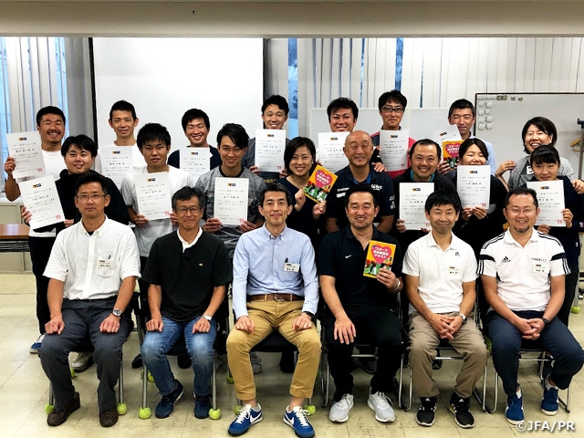 10月14日(月・祝)、神奈川県サッカー協会で、トレーナーやチーム関係者等17名を対象に「スポーツ救命ライセンス講習会」を開催。神奈川県サッカー協会医学委員会副委員長・高木博先生等が熱中症・脳振盪(のうしんとう)などに関する講義を行いました。実技では心肺蘇生の中でも最も重要な胸骨圧迫とAED(自動体外式除細動器)の使い方を学習し、バックボードへの全身固定・搬送法についても学びました。本講習会の合格者には修了証(3年間有効のライセンス証)が渡されました。