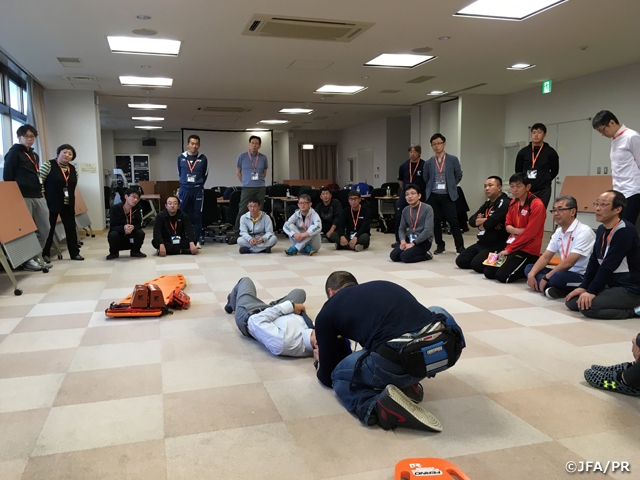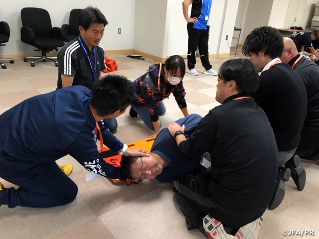 日本サッカー協会は、ピッチ上の選手の安全を守ることを第一とした「スポーツ救命ライセンス講習会」と「JFA+PUSHコース」を2017年から実施しています。「スポーツ救命ライセンス講習会」は、(公財)日本スポーツ協会(JSPO)公認アスレティックトレーナーが資格更新のために保有しなければならないBLS(Basic Life Support:一次救命処置)資格取得のための講習会として認定されています。