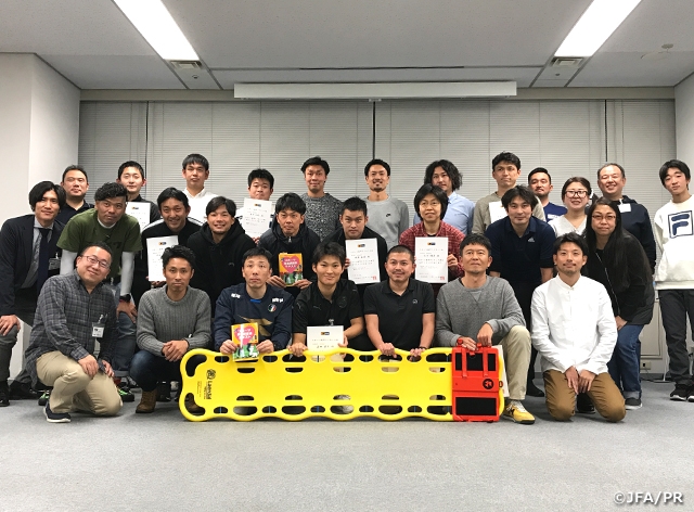 1月4日(土)JFAハウスで行われた更新の講習会(午前の部)にはJリーグクラブチーム関係者17名が参加し、新規と更新を兼ねた会(午後の部)は同じく19名が参加しました。更新の講習は実技と試験を行い、新規者等には熱中症・脳振盪(のうしんとう)などの講義と、実技で心肺蘇生の中でも最も重要な胸骨圧迫とAED(自動体外式除細動器)の使い方を学習し、バックボードによる全身固定・搬送法についても学びました。受講者の皆さんはAEDの重要性を認識し、普段の生活においてもAED設置場所を意識するなど、AEDへの関心も高まりました。