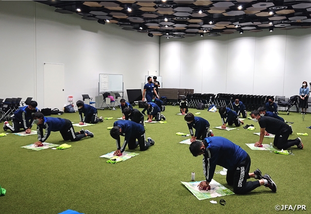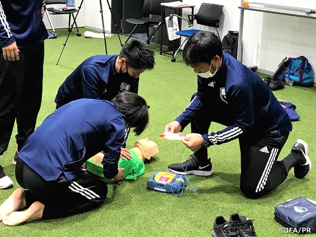 10月21日(水)に行ったオンラインでの講義では、心肺蘇生・熱中症・脳振盪(のうしんとう)などに関する講義を行い、27日は、高円宮記念JFA夢フィールドにて、感染対策を講じた上で実技を行いました。心肺蘇生の中でも最も重要な「胸骨圧迫とAED(自動体外式除細動器)の使い方」を習得するため、CPR(心肺蘇生法)トレーニングキット「あっぱくんライト」を用いて、胸骨圧迫とAEDの使い方を学習し、一流の指導者になるための研修の一環として、選手の命を守る方法を身に付けました。