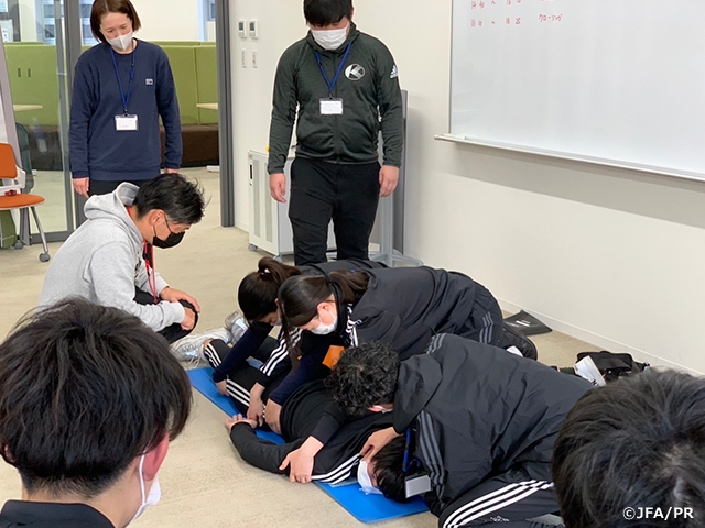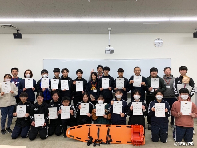 日本サッカー協会は、ピッチ上の選手の安全を守ることを第一とした「スポーツ救命ライセンス講習会」と簡易救命講習会である「JFA+PUSHコース」を2017年から実施しています。「スポーツ救命ライセンス講習会」は、(公財)日本スポーツ協会(JSPO)公認アスレティックトレーナーが資格更新のために保有しなければならないBLS(Basic Life Support:一次救命処置)資格取得のための講習会として認定されています。