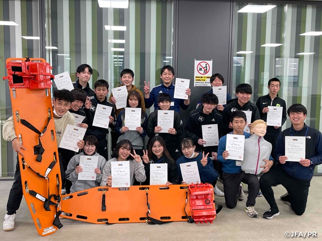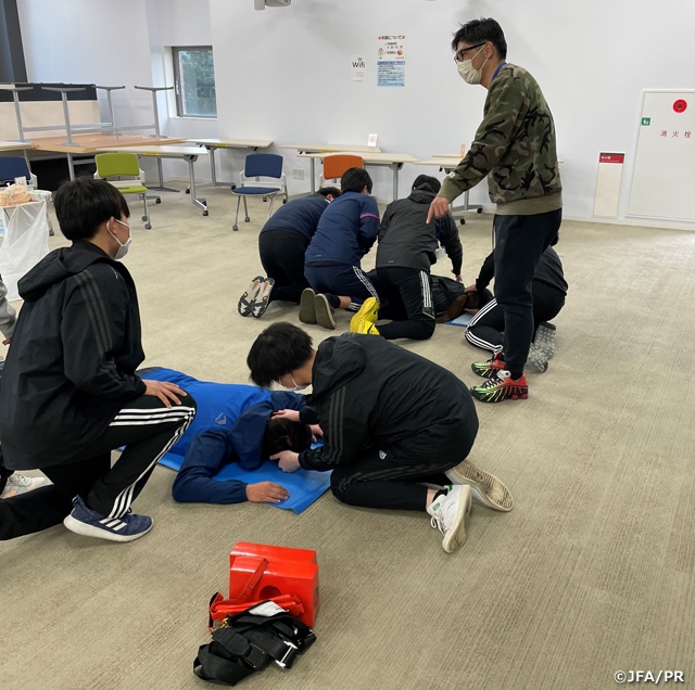 日本サッカー協会は、ピッチ上の選手の安全を守ることを第一とした「スポーツ救命ライセンス講習会」と簡易救命講習会である「JFA+PUSHコース」を2017年から実施しています。「スポーツ救命ライセンス講習会」は、(公財)日本スポーツ協会(JSPO)公認アスレティックトレーナーが資格更新のために保有しなければならないBLS(Basic Life Support:一次救命処置)資格取得のための講習会として認定されています。
