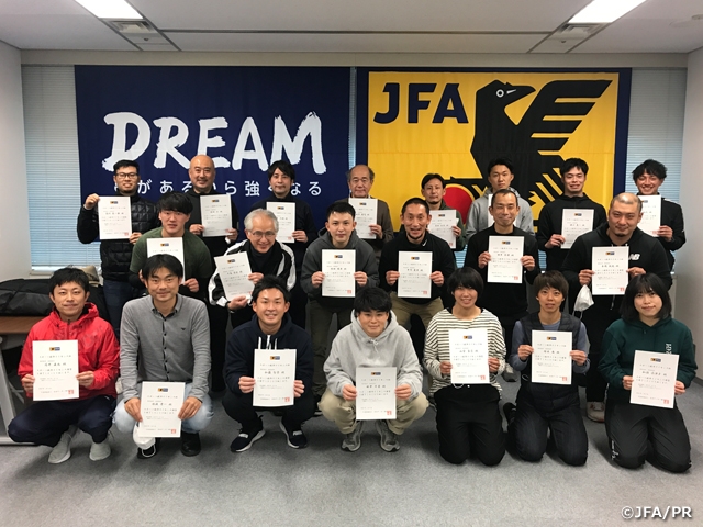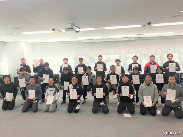 日本サッカー協会は、ピッチ上の選手の安全を守ることを第一とした「スポーツ救命ライセンス講習会」と簡易救命講習会である「JFA+PUSHコース」を2017年から実施しています。1月8日(土)にJFAハウスで開催された更新講習会にはJクラブ関係者など午前・午後の部合わせて32人、新規講習会は13人が参加しました。更新受講者は実技と試験を、新規受講者には熱中症・脳振盪(のうしんとう)などの講義と実技がありました。心肺蘇生の中でも最も重要となる胸骨圧迫とAED(自動体外式除細動器)の使い方や、バックボードによる全身固定・搬送についても学習しました。受講者はAEDの重要性を認識し、日常生活においてもAED設置場所を意識するなど、AEDへの関心も高めていました。