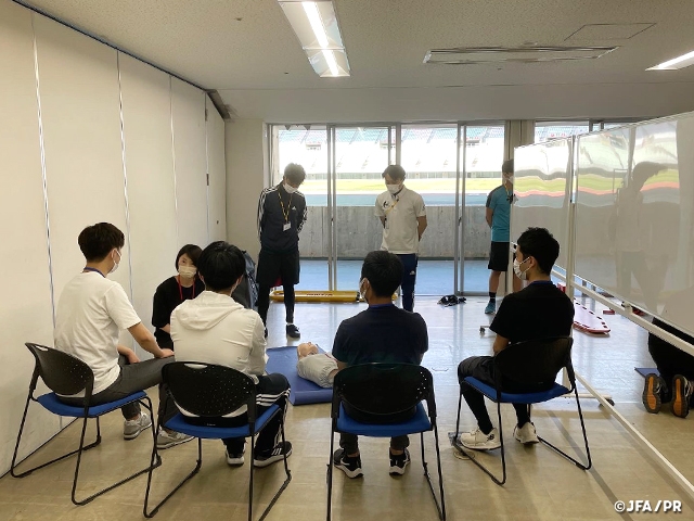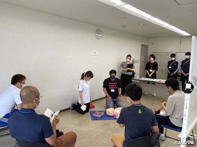 日本サッカー協会は、ピッチ上の選手の安全を守ることを第一とした「スポーツ救命ライセンス講習会」と簡易救命講習会である「JFA+PUSHコース」を2017年から実施しています。「スポーツ救命ライセンス講習会」は、(公財)日本スポーツ協会(JSPO)公認アスレティックトレーナーが資格更新のために保有しなければならないBLS(Basic Life Support:一次救命処置)資格取得のための講習会として認定されています。