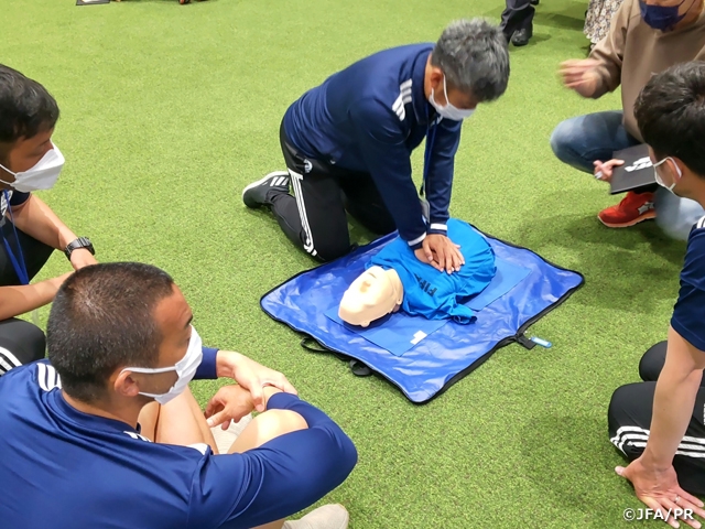 日本サッカー協会は、ピッチ上の選手の安全を守ることを第一とした「スポーツ救命ライセンス講習会」と簡易救命講習会である「JFA+PUSHコース」を2017年から実施しています。「スポーツ救命ライセンス講習会」は、(公財)日本スポーツ協会(JSPO)公認アスレティックトレーナーが資格更新のために保有しなければならないBLS(Basic Life Support:一次救命処置)資格取得のための講習会として認定されています。