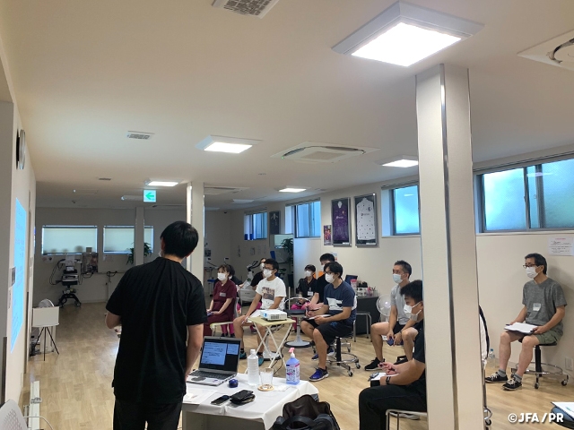 今回のJFA+PUSHの講習では、心肺蘇生に関する知識、脳振盪、熱中症についての講義と心肺蘇生についての実技を行っていただきました。いずれも医療従事者やトレーナーとして必要不可欠な知識ではありますが、直面する機会が少ない故、普段から確認するだけでなく、講習や実技を通して確認していくことが重要であると再認識しました。脳振盪・熱中症では実際の映像や代表チームが行っている事例も交えてご講義いただき、具体的かつ正しい知識を身につけることができました。自己研鑽だけではなく、多くの人にも知識を共有し、助けられる命を増やしていければと思います。コロナ禍のお忙しい中、講師を務めていただきました福島理文先生、本当にありがとうございました。