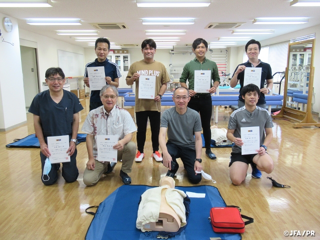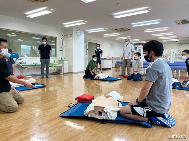 日本サッカー協会は、ピッチ上の選手の安全を守ることを第一とした「スポーツ救命ライセンス講習会」と簡易救命講習会である「JFA+PUSHコース」を2017年から実施しています。「スポーツ救命ライセンス講習会」は、(公財)日本スポーツ協会(JSPO)公認アスレティックトレーナーが資格更新のために保有しなければならないBLS(Basic Life Support:一次救命処置)資格取得のための講習会として認定されています。