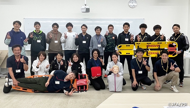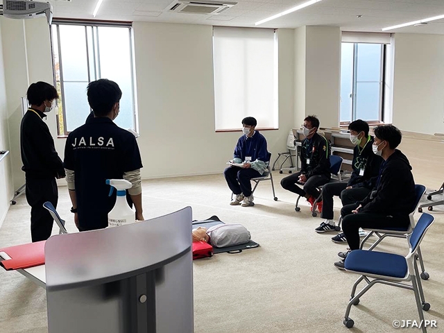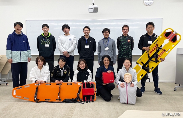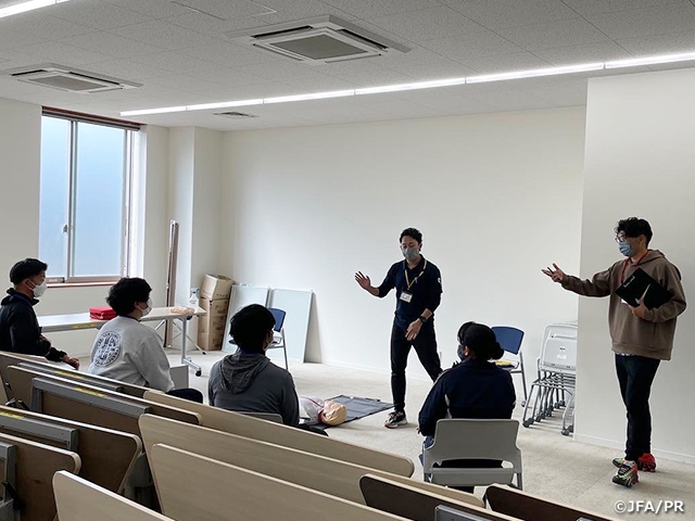 日本サッカー協会(JFA)は、ピッチ上の選手の安全を守ることを第一とした「スポーツ救命ライセンス講習会」と簡易救命講習会である「JFA+PUSHコース」を2017年から実施しています。「スポーツ救命ライセンス講習会」は、(公財)日本スポーツ協会(JSPO)公認アスレティックトレーナーが資格更新のために保有しなければならないBLS(Basic Life Support:一次救命処置)資格取得のための講習会として認定されています。