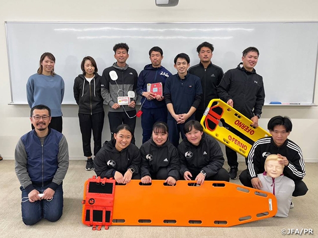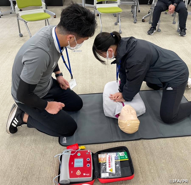 日本サッカー協会は、ピッチ上の選手の安全を守ることを第一とした「スポーツ救命ライセンス講習会」と簡易救命講習会である「JFA+PUSHコース」を2017年から実施しています。「スポーツ救命ライセンス講習会」は、(公財)日本スポーツ協会(JSPO)公認アスレティックトレーナーが資格更新のために保有しなければならないBLS(Basic Life Support:一次救命処置)資格取得のための講習会として認定されています。