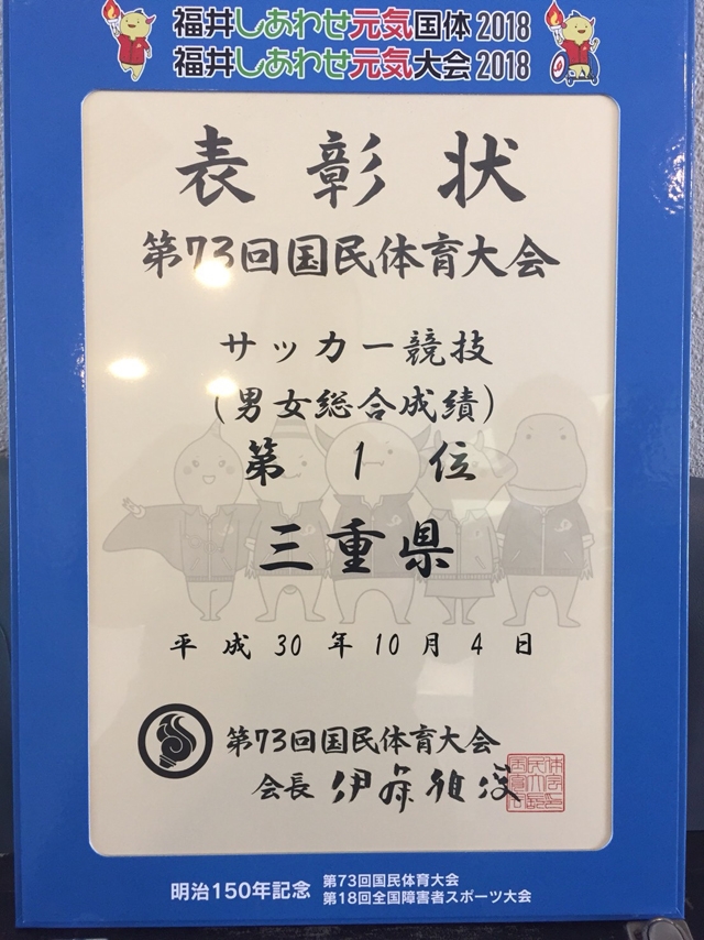 成年男子・成年女子・少年の3種別の得点合計で、サッカー競技として三重県が総合優勝させて頂きました。