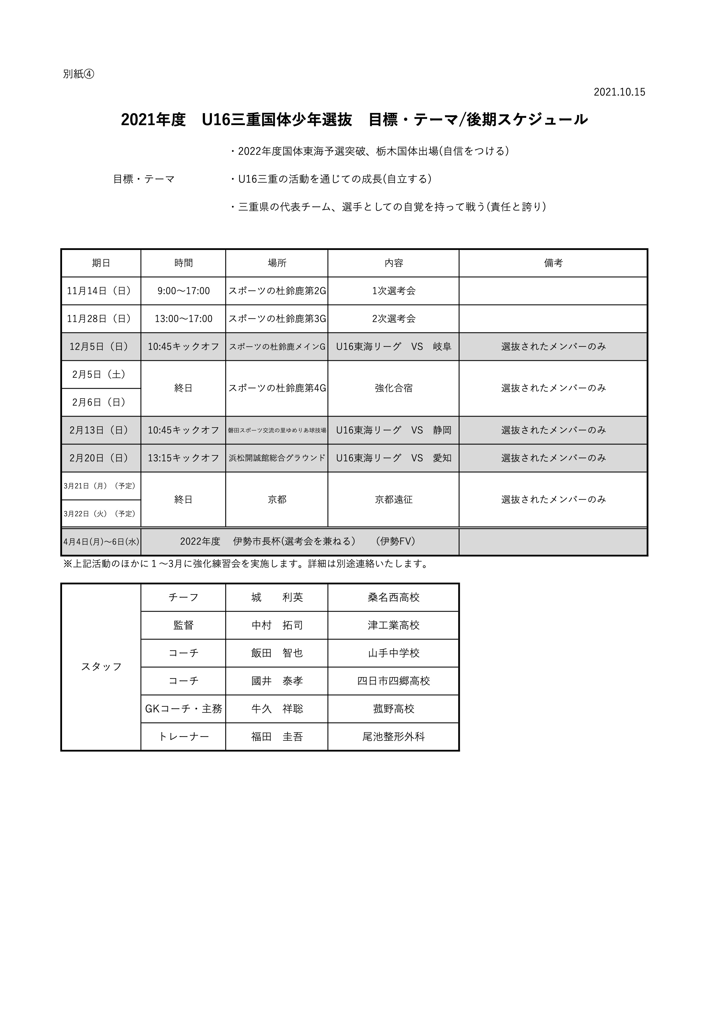 2021年度 U16国体少年選抜 後期スケジュールについて