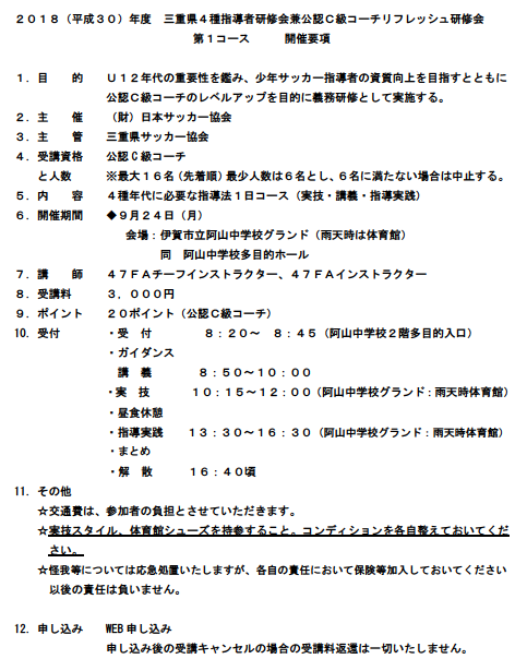201 8(平成 30 )年度 三重県4種 指導者研修会兼 公認C級コーチリフレッシュ研修会 について