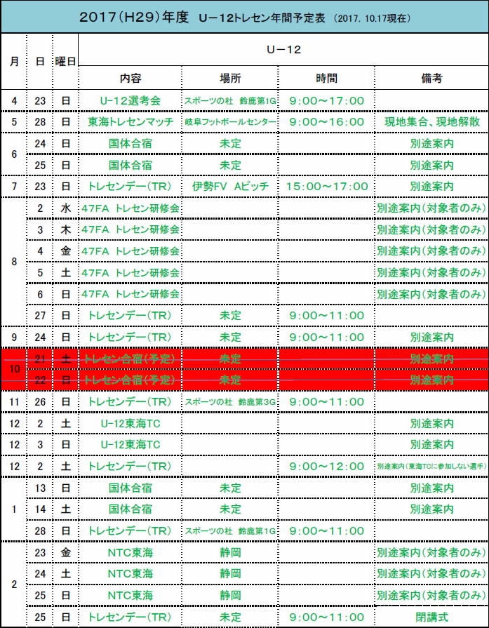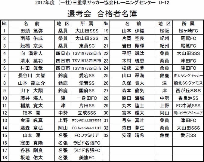 【2017年度】三重県サッカー協会 トレセンU-12 スケジュール&選考会 合格者名簿