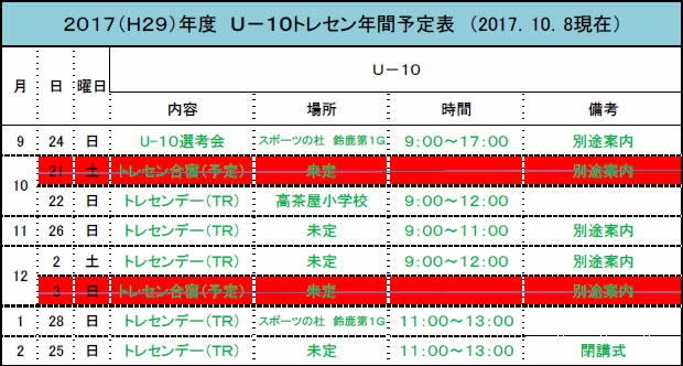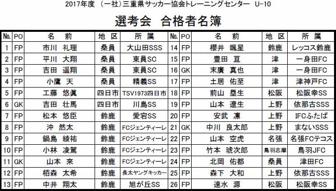 【2017年度】三重県サッカー協会 トレセンU-10 スケジュール&選考会 合格者名簿