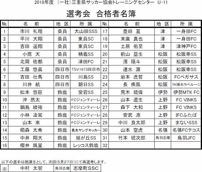 ホーム > 三重県サッカー協会 > 最新ニュース一覧 > 【2018年度】三重県サッカー協会 トレセンU-11 スケジュール&選考会 合格者名簿
