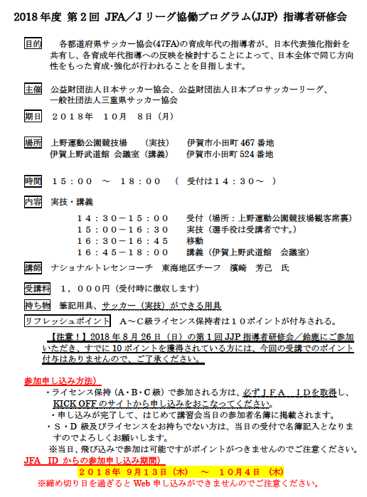 10/8(月)2018年度 第2回 JFA/Jリーグ協働プログラム(JJP) 指導者研修会の案内