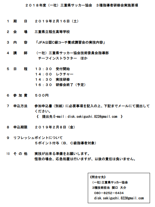 2018年度(一社)三重県サッカー協会 3種指導者研修会について