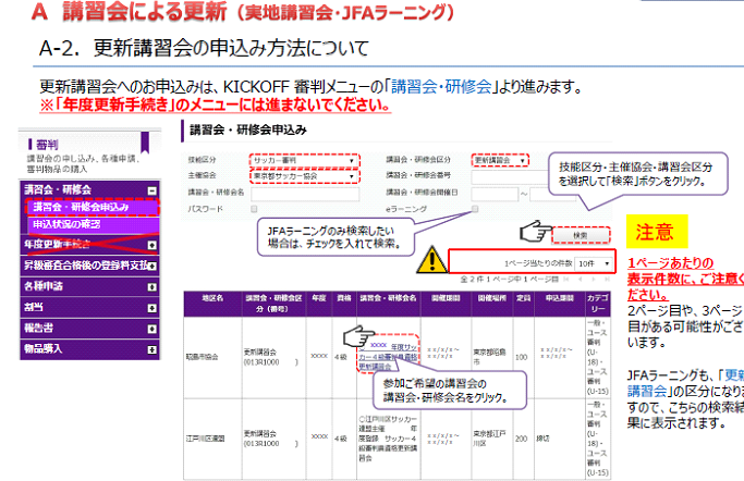 4級審判員の方は「実地講習会を受講」または、Web上で受講する「JFAラーニング」どちらかの方法で更新して下さい。