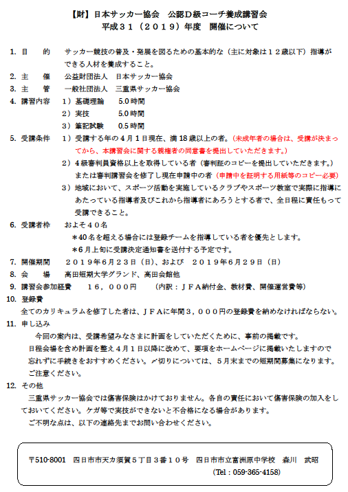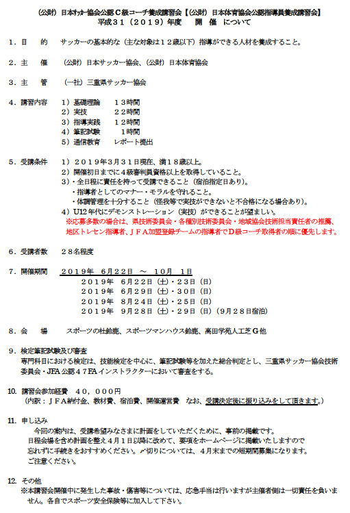 C級・D級 コーチ養成講習会 受講希望者研修会案内