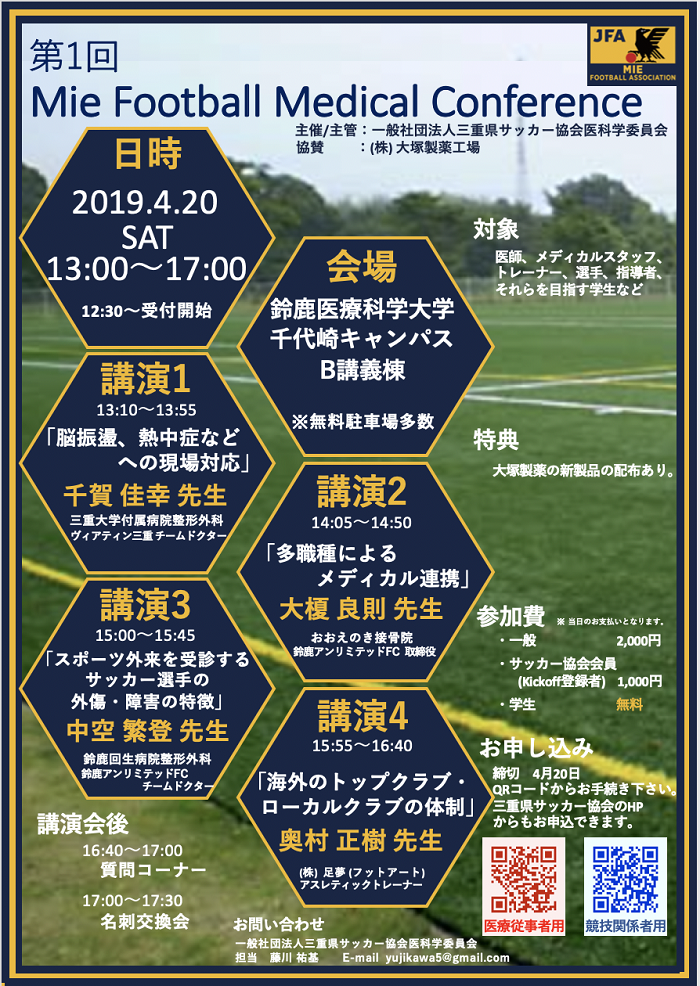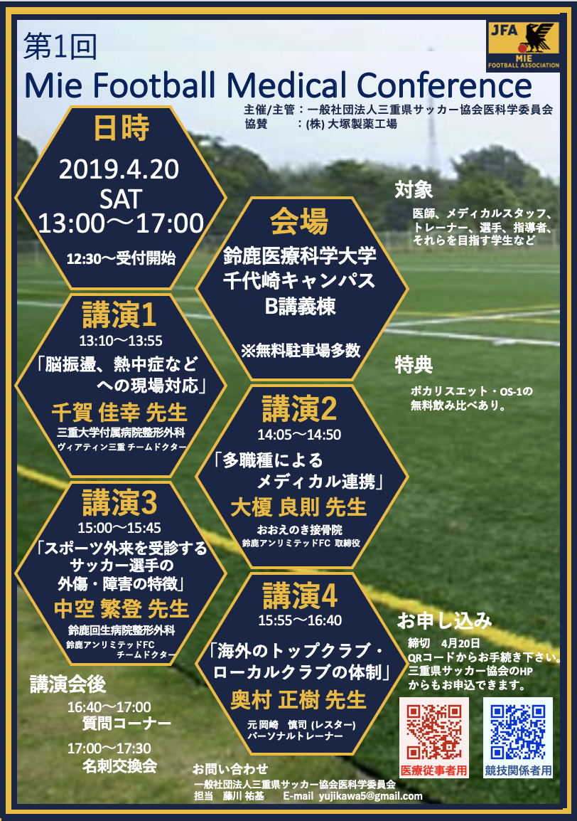 ホーム > 三重県サッカー協会 > 最新ニュース一覧 > 【受講者募集!】第1回 Mie Football Medical Conference開催について