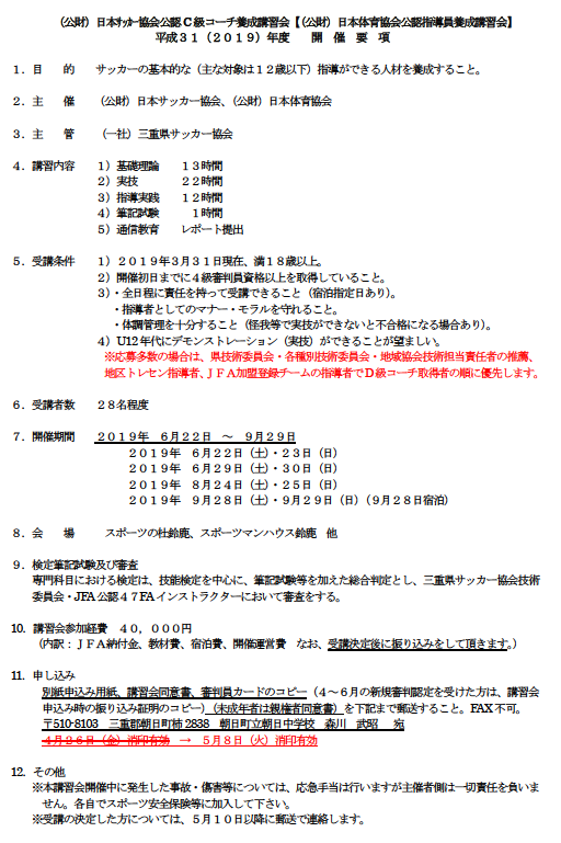 【2019年度】公認C級コーチ養成講習会受付期間延長のお知らせ