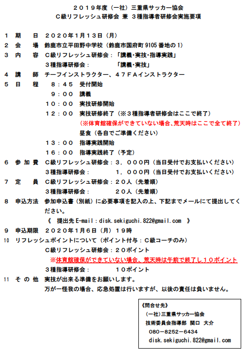 2019年度(一社)三重県サッカー協会 C級リフレッシュ研修会 兼 3種指導者研修会について