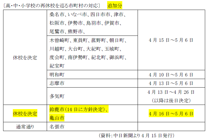 新型コロナウイルス感染症の拡大で、県が「感染拡大阻止緊急宣言」を出し、県立高校などの休業を決めたことを受け、県内の26市町が小・中学校を再休業とすると発表されました。さらに、本日、検討中であった、鈴鹿市、亀山市が臨時休業を発表しました。