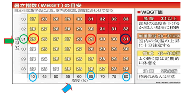 暑さ指数( WBGT ) は周辺の熱環境(気温、湿度、輻射熱、気流)から「暑さ」を総合的に評価する指標です。運動前や運 動中の暑さ指数をモニターし、日本スポーツ協会の運動指針に応じて運動強度の調整や運動中止を決定します。