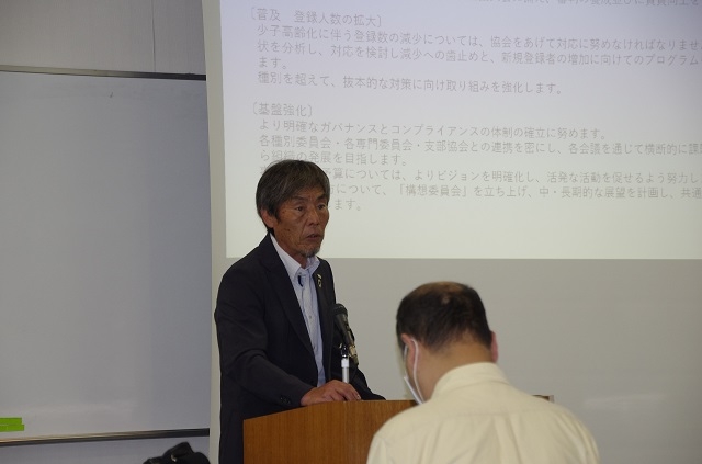議案について説明する藤田専務理事