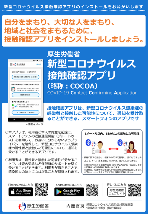 『新型コロナウイルス接触確認アプリ『COCOA』のインストールを推奨します!