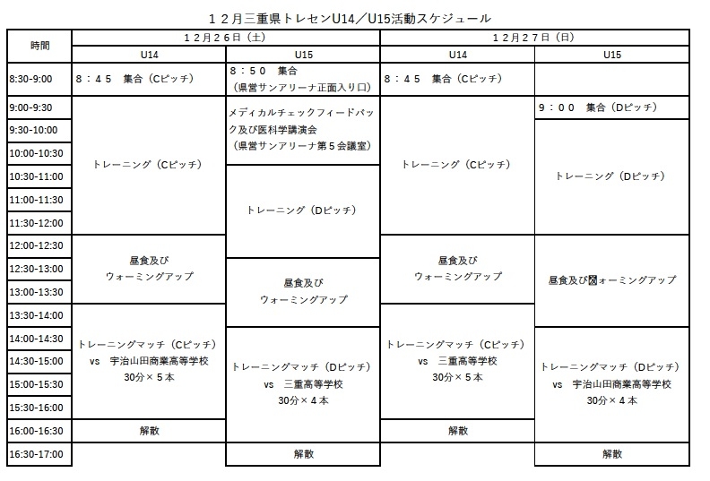 12月の三重県トレセンU14・U15の活動スケジュールです。観戦につきましては、保護者の方に限らせていただきます。感染対策を徹底していただいた上でお願いいたします。