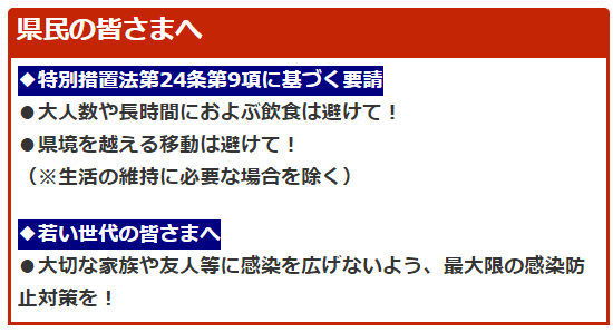○通勤、通学等で県外を訪問される場合は、大人数や長時間の飲食の場への参加は避けてください。