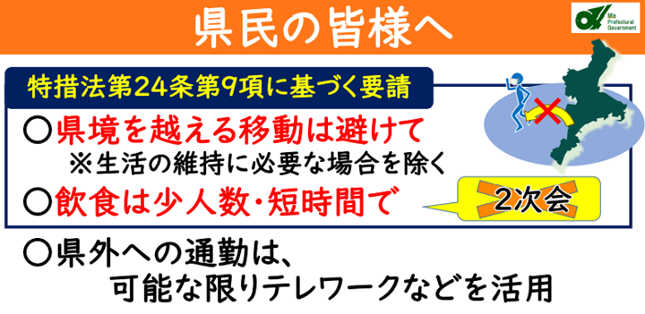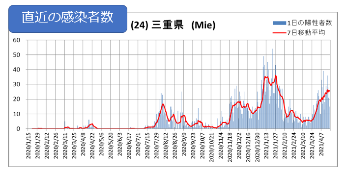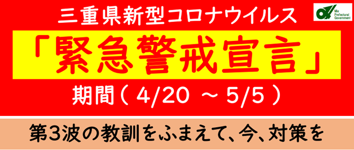 | 三重県 | 4月20日(火) | 「緊急警戒宣言」発表4/20~5/5 ・第3波の教訓をふまえて、今、対策を! ・県民の皆さまの命を守り、医療提供体制を確保 |