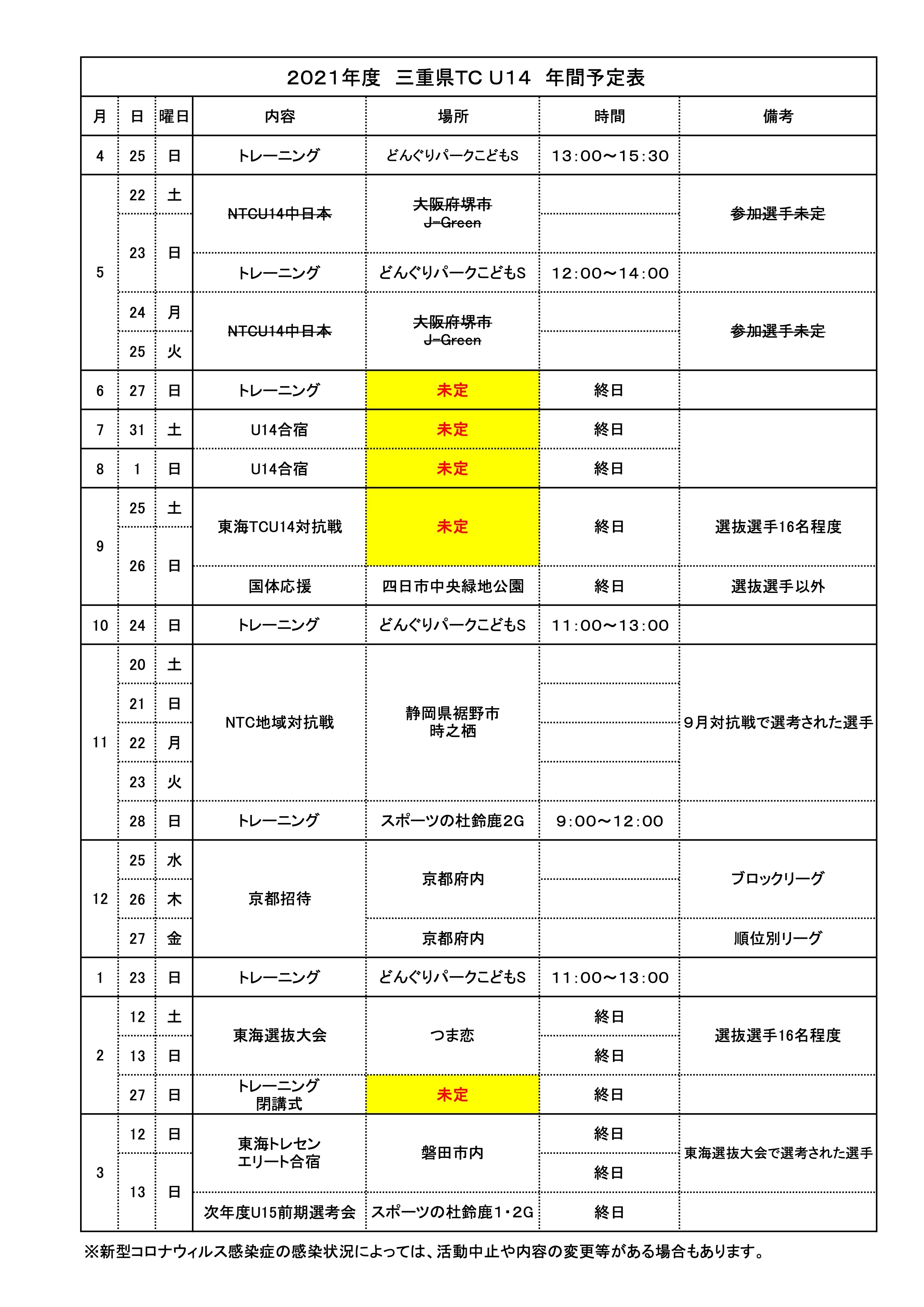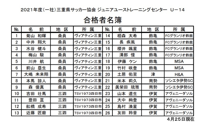 【2021年度】三重県サッカー協会 トレセンU-14 スケジュール・合格者名簿
