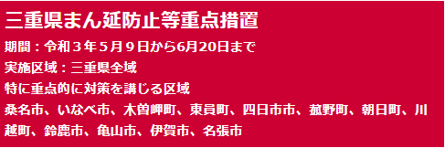 5月9日の措置実施以降、新規感染者数は減少傾向がみられます。これは県民、事業者の皆様が苦しい状況の中、ご協力いただいた結果であり、感謝を申し上げます。 一方で、病床占有率は35%前後、重症者用病床の占有率は20%を超える状況が 続くなど、医療体制への負荷は厳しい状況が続いています。 医療体制への負荷が続くと、通常医療へも影響を及ぼし、市町や関係機関の皆様 のご協力により進んでいるワクチン接種を妨げることとなるため、ここでしっかりと感染の減少傾向を確かなものにしていく必要があります。また、愛知県や大阪府など近隣府県において緊急事態宣言、岐阜県においてはまん延防止等重点措置が延長さ れるなど、予断を許さない状況が続いており、感染を広げないためには面的、広域的に取り組んでいく必要があります。 こうした状況の中、感染を抑え込むためには、まん延防止等重点措置の延長が必 要であると考え、政府と協議を続けてきたところ、6月20日までの延長が決定されました。これに合わせ、「三重県まん延防止等重点措置」についても期間を6月20日ま で延長いたします