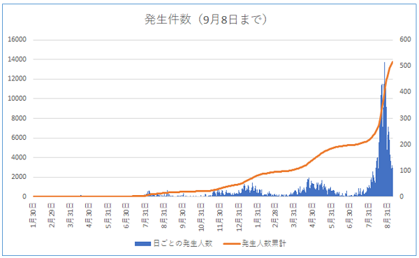 ➀緊急事態宣言が発出され、新規感染者数が大きく増加している